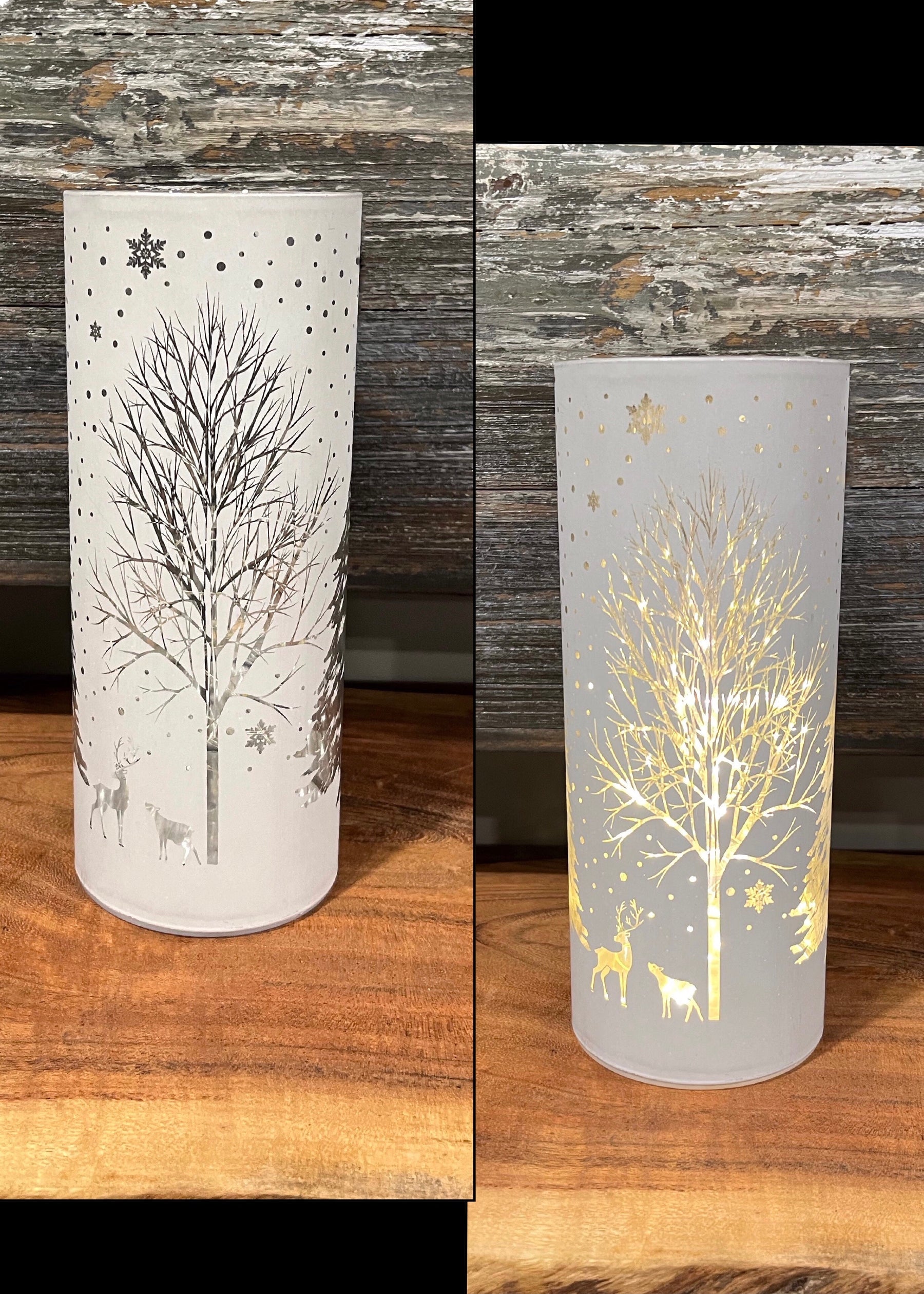 Add a touch of winter elegance to your holiday décor with this 3.5" x 8" matte white glass cylinder, beautifully illuminated from within by warm white LED lights. The classic reindeer and tree design brings a festive charm to any space.