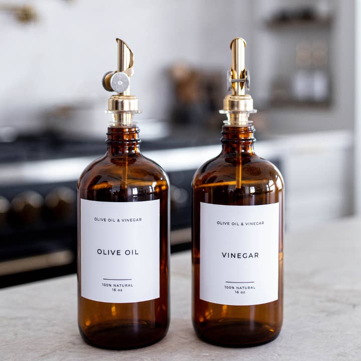 The Amber Glass Olive Oil & Vinegar Bottles are a great way to elevate your kitchen. These bottles feature a sleek matte label designed to let you easily see what's inside. Each glass bottle has a stainless steel pour spout.