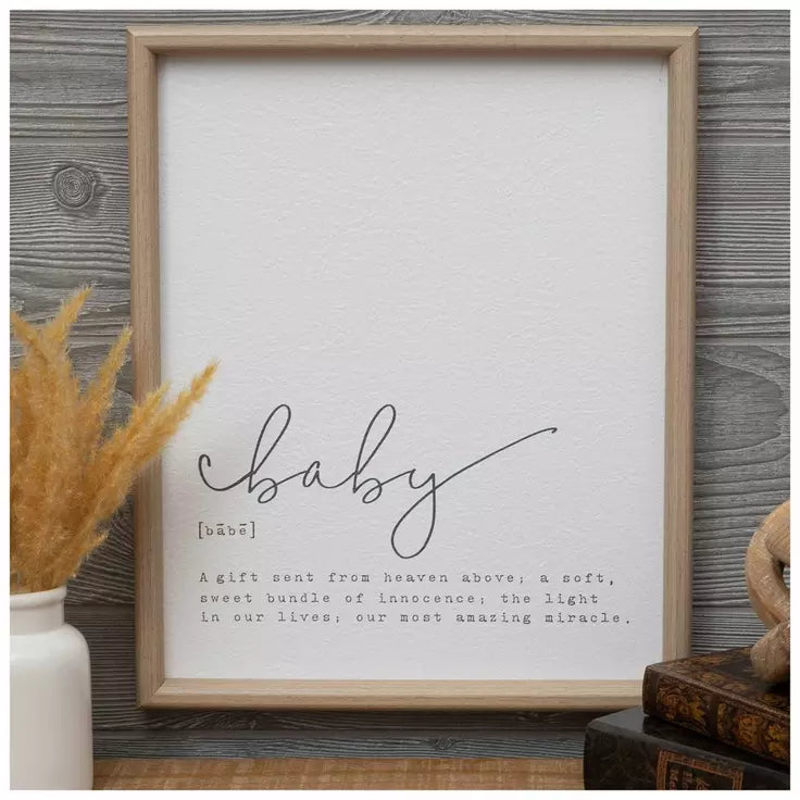 Decorate your newborn's nursery with thoughtful accents, like this Baby Definition Wood Wall Decor. This MDF piece comes in a woodgrain frame and is a great gift for new or expecting parents. Inside the frame is a sweet definition for "Baby," written on a textured white background. Match this accent piece with other decor to create a loving atmosphere in your home!