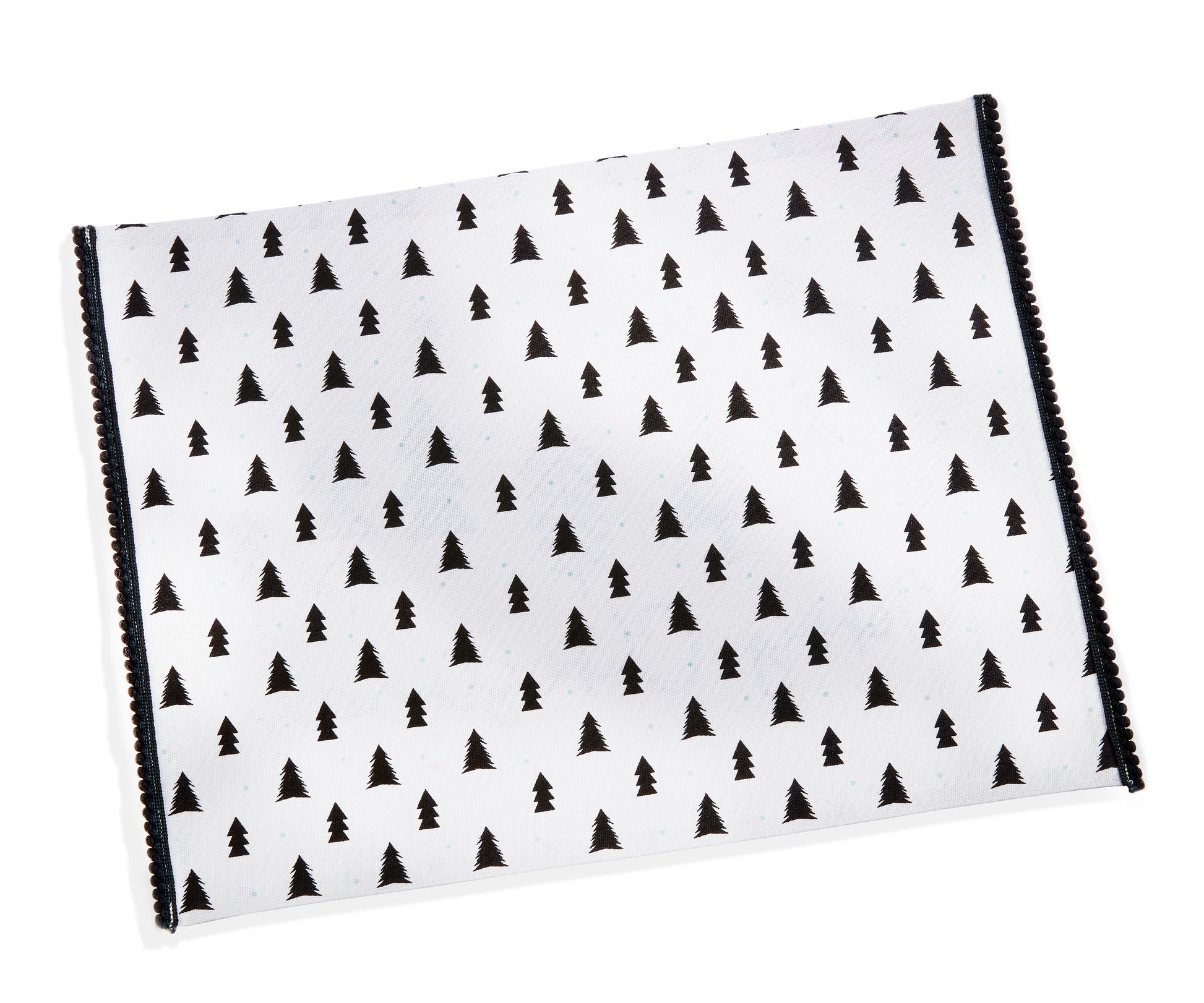 This double-sided placemat features minimalistic graphics of spruces and conifers in black and white prints with sentiment: MERRY CHRISTMAS.