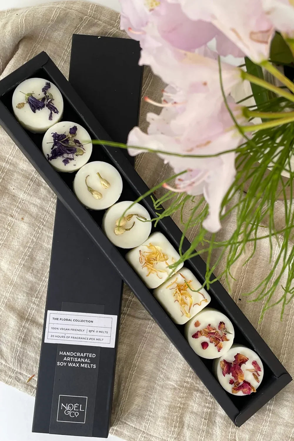 The Floral Collection: Designed to bring the natural beauty of freshly picked flowers into your home, this carefully curated collection includes 8 soy wax melts: 2 Vetiver & Violet, 2 The Florist, 2 Hinoki & Yuzu, 2 Midnight Bloom