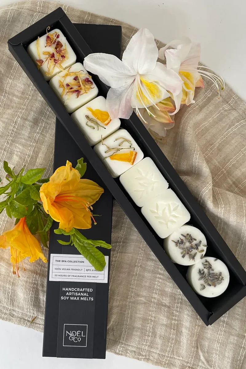 The Spa Collection: Designed to bring you the spa experience into your home, this carefully curated collection includes 8 soy wax melts: 2 Lotus, 2 Refresh, 2 Spa Day, 2 Calm