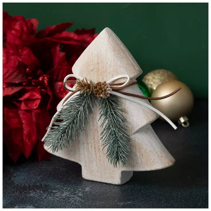 Add a rustic touch to your holiday decor using this Whitewash Pine & Pinecone Wood Tree. This resin is made to look like carved wood and features a chunky evergreen shape with a whitewashed finish, perfect for farmhouse-inspired homes. Adorning the front are two faux leather bows with pine and pinecone embellishments. Place this tree on your entryway table or mantel along with other wintry decor for a charming woodland arrangement.