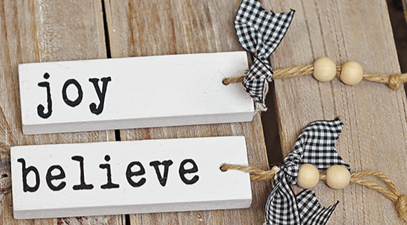 Accent your tree with these wood word blocks. With Jute rope & Black Checkered Bow